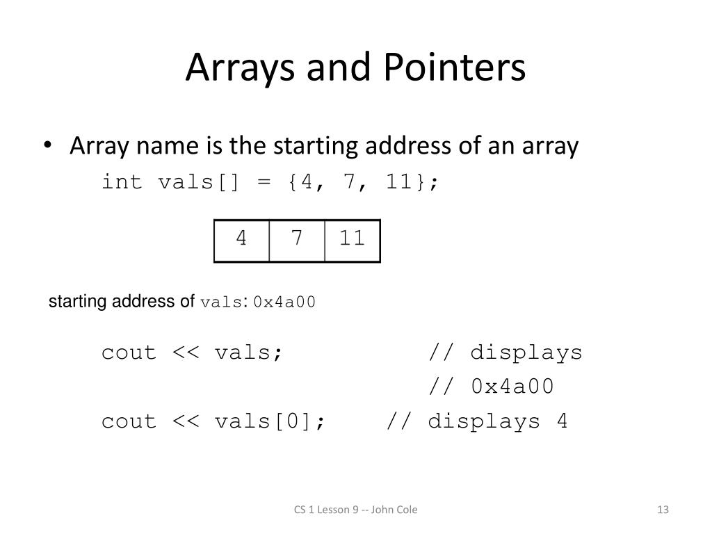 Arrays and Pointers • Array name is the starting address of an array intvals[] = {4, 7, 11}; cout << vals; // displays // 0x4a00 cout << vals[0]; // displays 4 starting address of vals: 0x4a00 CS 1 Lesson 9 -- John Cole