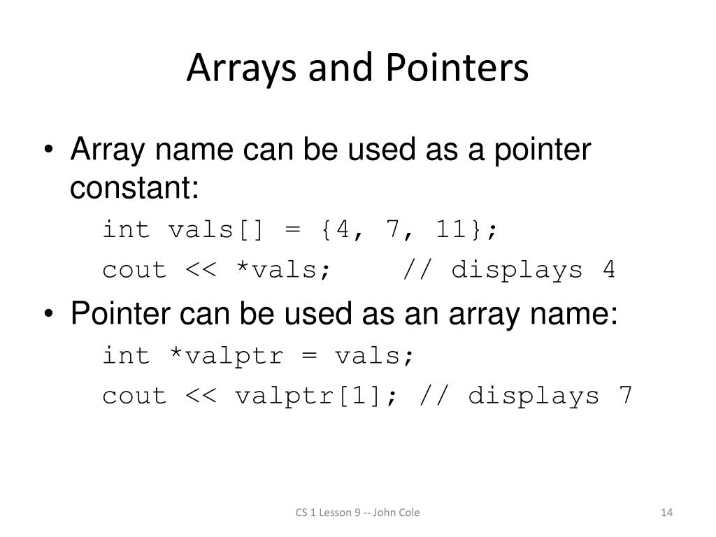Arrays and Pointers • Array name can be used as a pointer constant: intvals[] = {4, 7, 11}; cout << *vals; // displays 4 • Pointer can be used as an array name: int *valptr = vals; cout << valptr[1]; // displays 7 CS 1 Lesson 9 -- John Cole
