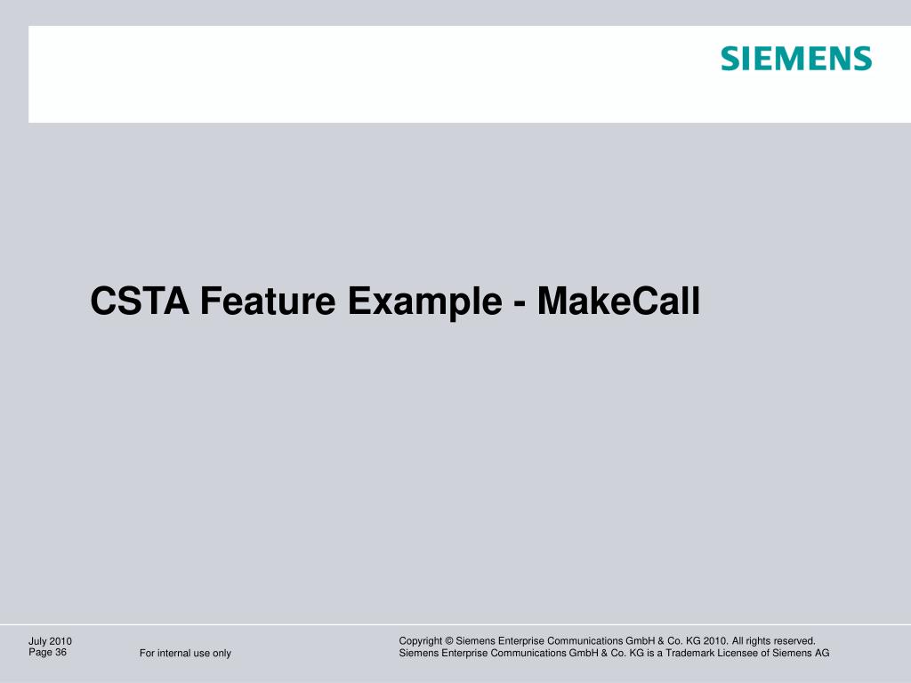 CSTA – References • CSTA Standards: ECMA http://www.ecma-international.org/activities/Communications/TG11/cstaIII.htm • Other CSTA related documentation at ESY-Wiki http://usbrws01.bocb.siemens.com/mwiki/index.php/DevCallProcessingCSTA • CSTA Browser (ESY-Wiki) http://usbrws01.bocb.siemens.com/mwiki/index.php/DevToolsCSTABrowserTool