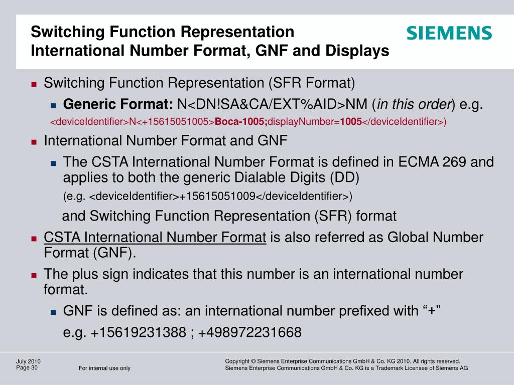 Switching Function Representation International Number Format, GNF and Displays • Switching Function Representation (SFR Format) • Generic Format: N<DN!SA&CA/EXT%AID>NM (in this order) e.g. <deviceIdentifier>N<+15615051005>Boca-1005;displayNumber=1005</deviceIdentifier>) • International Number Format and GNF • The CSTA International Number Format is defined in ECMA 269 and applies to both the generic Dialable Digits (DD) (e.g. <deviceIdentifier>+15615051009</deviceIdentifier>) and Switching Function Representation (SFR) format • CSTA International Number Format is also referred as Global Number Format (GNF). • The plus sign indicates that this number is an international number format. • GNF is defined as: an international number prefixed with “+” e.g. +15619231388 ; +498972231668