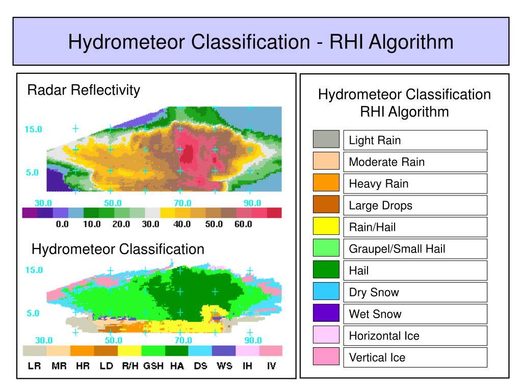 Hydrometeor Classification - RHI Algorithm Radar Reflectivity Hydrometeor Classification RHI Algorithm Light Rain Moderate Rain Heavy Rain Large Drops Rain/Hail Hydrometeor Classification Graupel/Small Hail Hail Dry Snow Wet Snow Horizontal Ice Vertical Ice