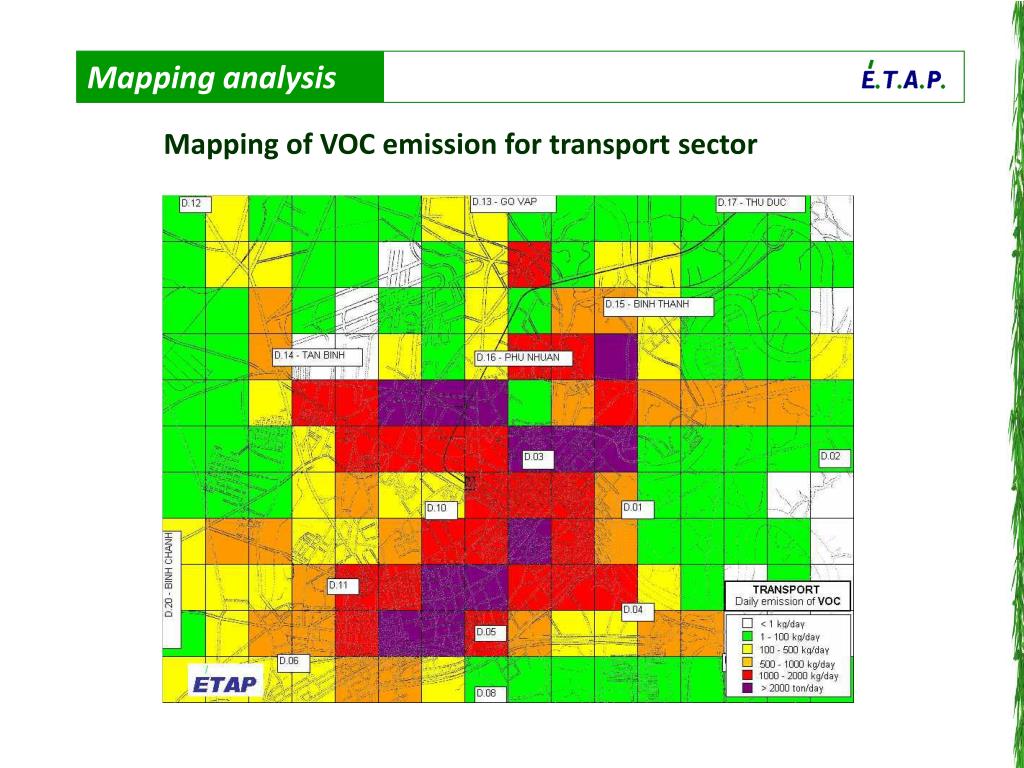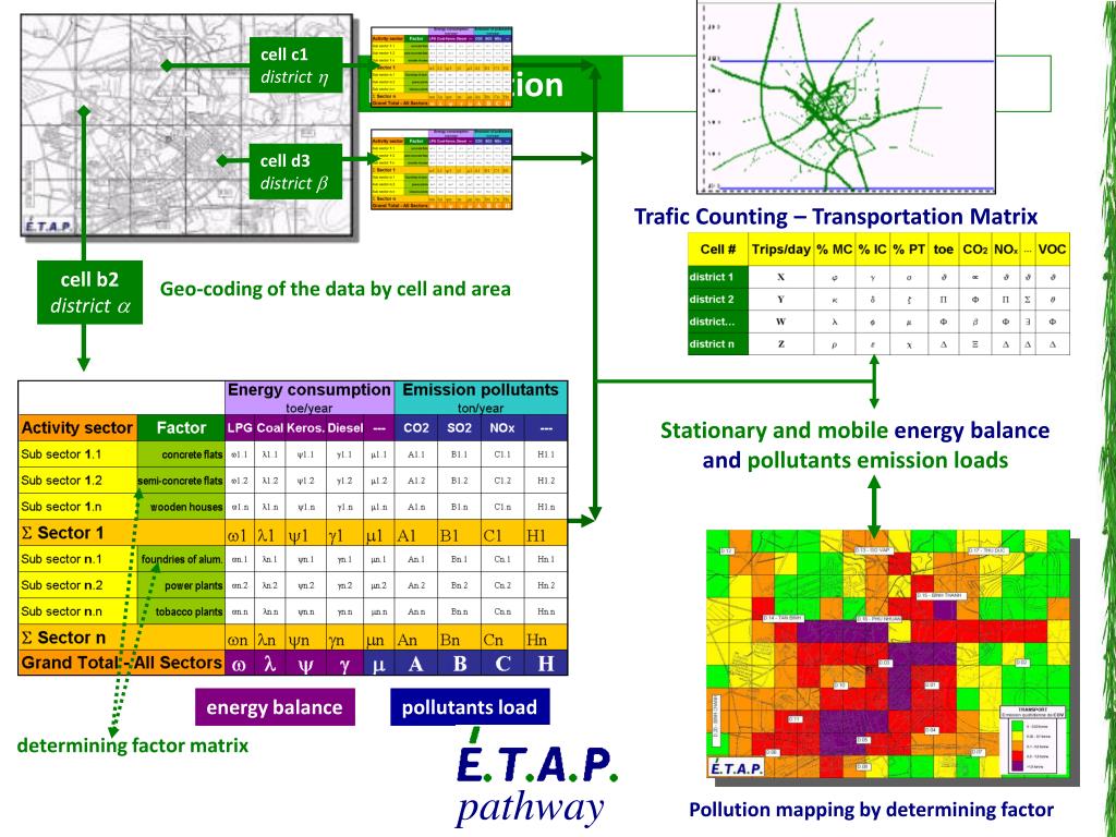 cell c1 district h cell d3 district b cell b2 district a Geo-coding of the data by cell and area Stationary and mobile energy balance and pollutants emission loads determining factor matrix ETAP Pathway presentation Trafic Counting – Transportation Matrix energy balance pollutants load pathway Pollution mapping by determining factor