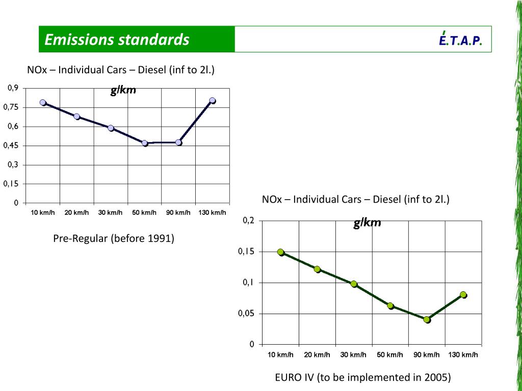 Emissions standards NOx – Individual Cars – Diesel (inf to 2l.) NOx – Individual Cars – Diesel (inf to 2l.) Pre-Regular (before 1991) EURO IV (to be implemented in 2005)