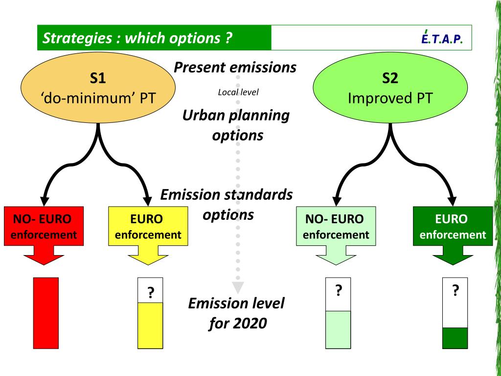 S1 ‘do-minimum’ PT S2 Improved PT Present emissions Local level Urban planning options Emission standards options NO- EURO enforcement EURO enforcement NO- EURO enforcement EURO enforcement ? ? ? Emission level for 2020 Strategies : which options ?