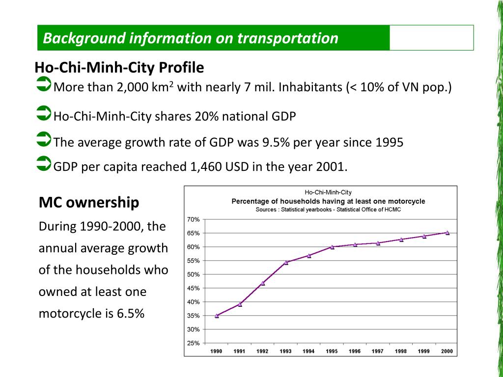 MC ownership Background information on transportation Ho-Chi-Minh-City Profile • More than 2,000 km2 with nearly 7 mil. Inhabitants (< 10% of VN pop.) • Ho-Chi-Minh-City shares 20% national GDP • The average growth rate of GDP was 9.5% per year since 1995 • GDP per capita reached 1,460 USD in the year 2001. During 1990-2000, the annual average growth of the households who owned at least one motorcycle is 6.5%