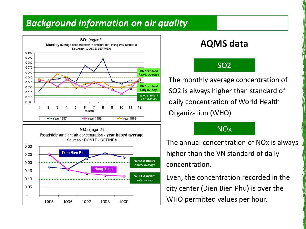 AQMS data SO2 Dien Bien Phu The monthly average concentration of SO2 is always higher than standard of daily concentration of World Health Organization (WHO) WHO Standard hourly average Hang Xanh VN Standard hourly average WHO Standard daily average WHO Standard daily average VN Standard daily average NOx The annual concentration of NOx is always higher than the VN standard of daily concentration. Even, the concentration recorded in the city center (Dien Bien Phu) is over the WHO permitted values per hour. Background information on air quality