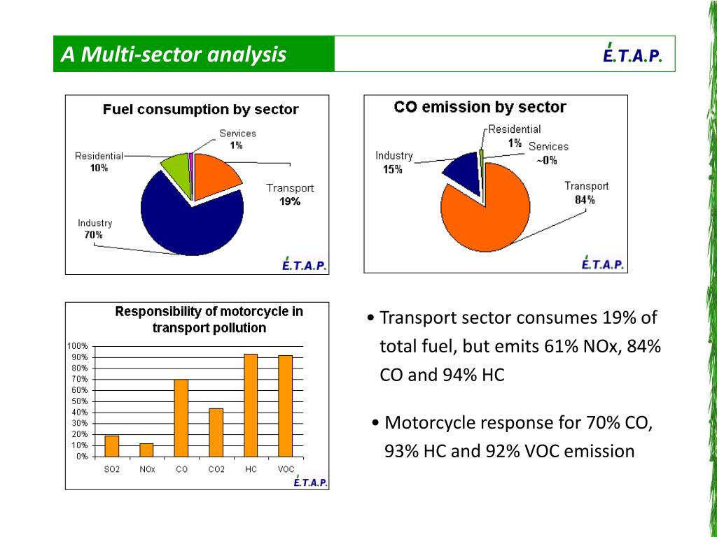 Transport sector consumes 19% of total fuel, but emits 61% NOx, 84% CO and 94% HC • Motorcycle response for 70% CO, 93% HC and 92% VOC emission A Multi-sector analysis