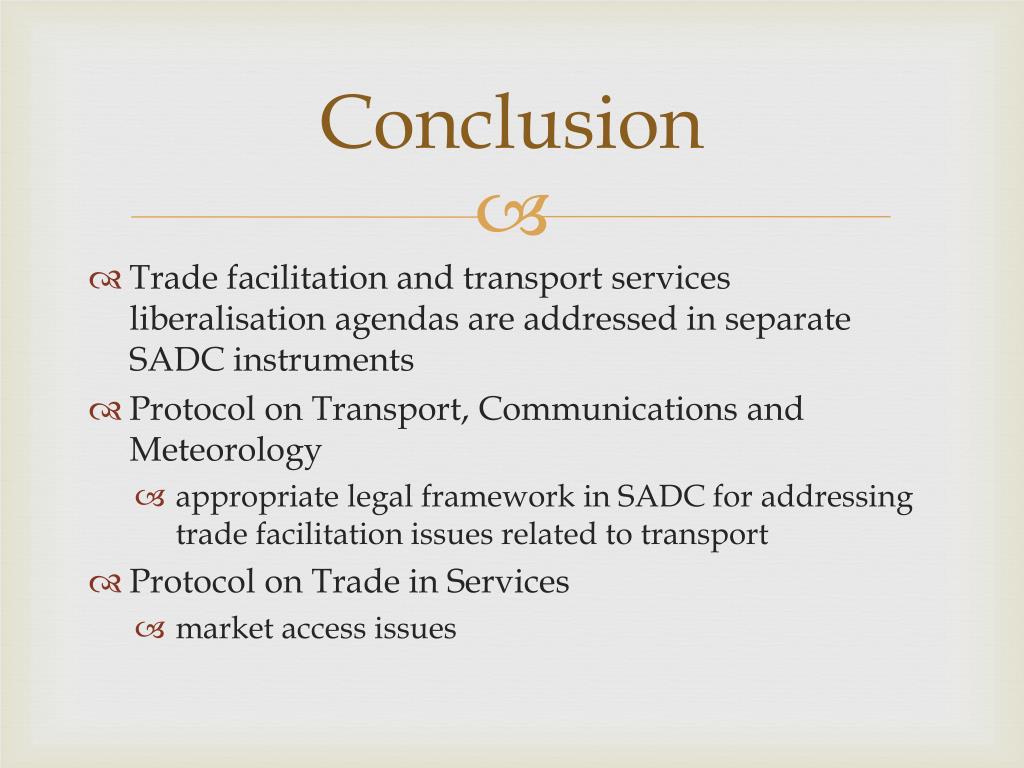 Conclusion • Trade facilitation and transport services liberalisation agendas are addressed in separate SADC instruments • Protocol on Transport, Communications and Meteorology • appropriate legal framework in SADC for addressing trade facilitation issues related to transport • Protocol on Trade in Services • market access issues