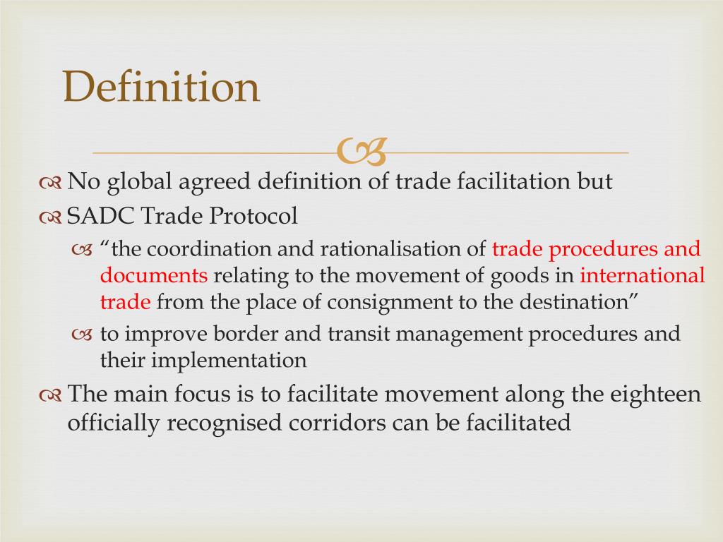 Definition • No global agreed definition of trade facilitation but • SADC Trade Protocol • “the coordination and rationalisation of trade procedures and documents relating to the movement of goods in international tradefrom the place of consignment to the destination” • to improve border and transit management procedures and their implementation • The main focus is to facilitate movement along the eighteen officially recognised corridors can be facilitated
