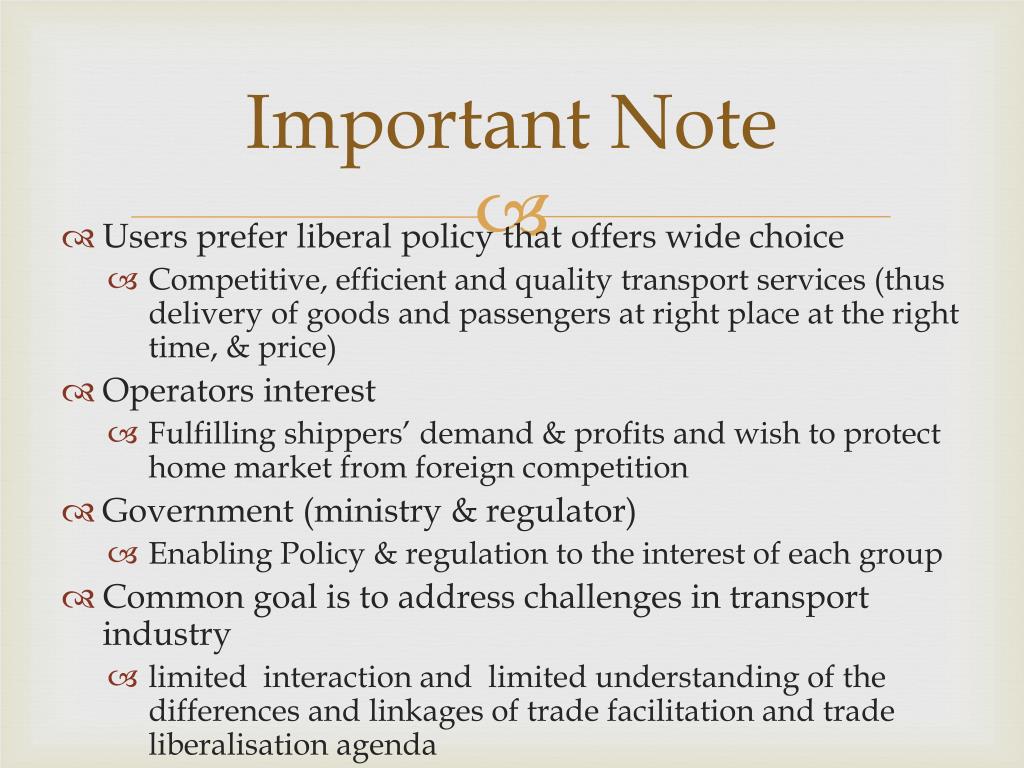 Important Note • Users prefer liberal policy that offers wide choice • Competitive, efficient and quality transport services (thus delivery of goods and passengers at right place at the right time, & price) • Operators interest • Fulfilling shippers’ demand & profits and wish to protect home market from foreign competition • Government (ministry & regulator) • Enabling Policy & regulation to the interest of each group • Common goal is to address challenges in transport industry • limited interaction and limited understanding of the differences and linkages of trade facilitation and trade liberalisation agenda