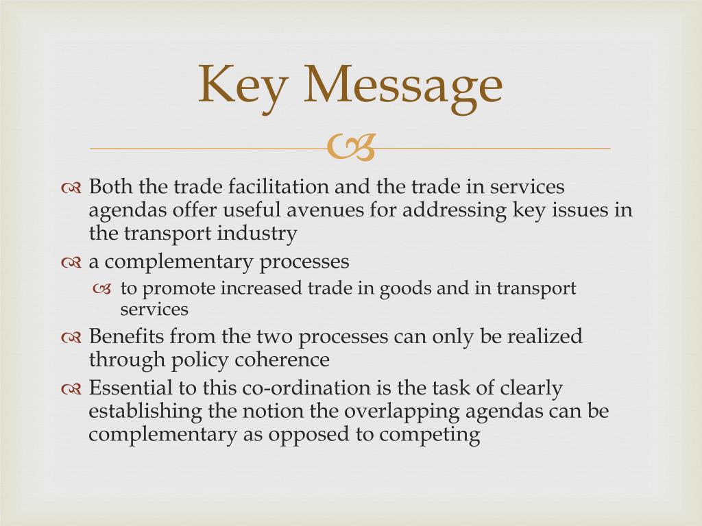 Key Message • Both the trade facilitation and the trade in services agendas offer useful avenues for addressing key issues in the transport industry • a complementary processes • to promote increased trade in goods and in transport services • Benefits from the two processes can only be realized through policy coherence • Essential to this co-ordination is the task of clearly establishing the notion the overlapping agendas can be complementary as opposed to competing