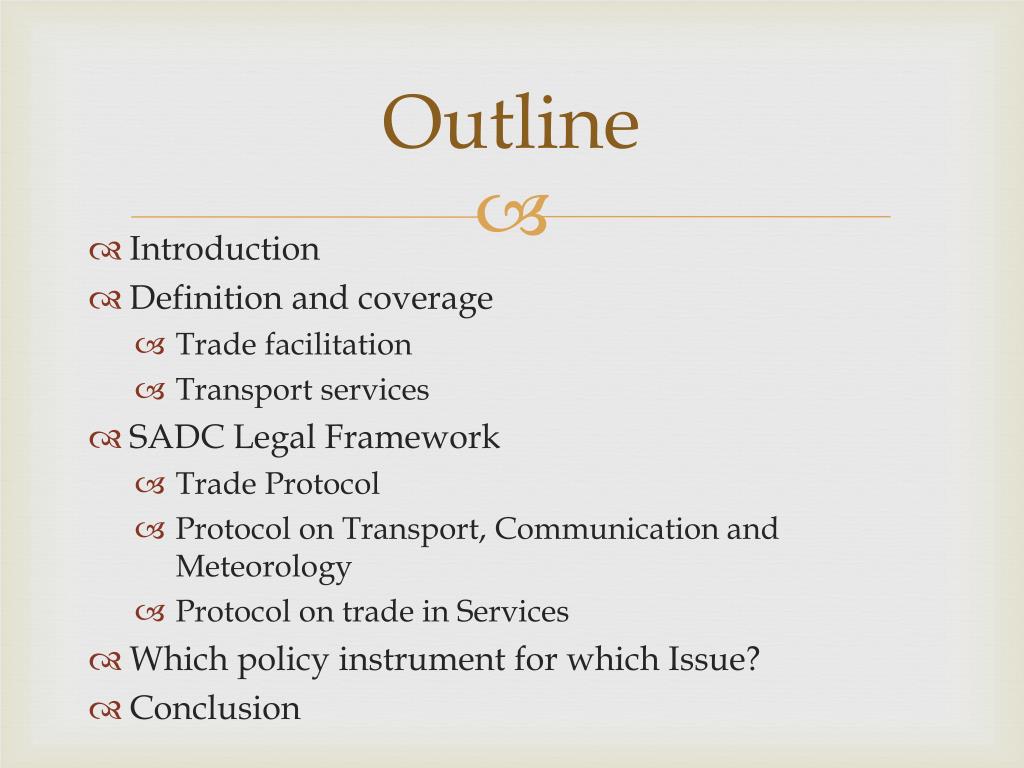Outline • Introduction • Definition and coverage • Trade facilitation • Transport services • SADC Legal Framework • Trade Protocol • Protocol on Transport, Communication and Meteorology • Protocol on trade in Services • Which policy instrument for which Issue? • Conclusion
