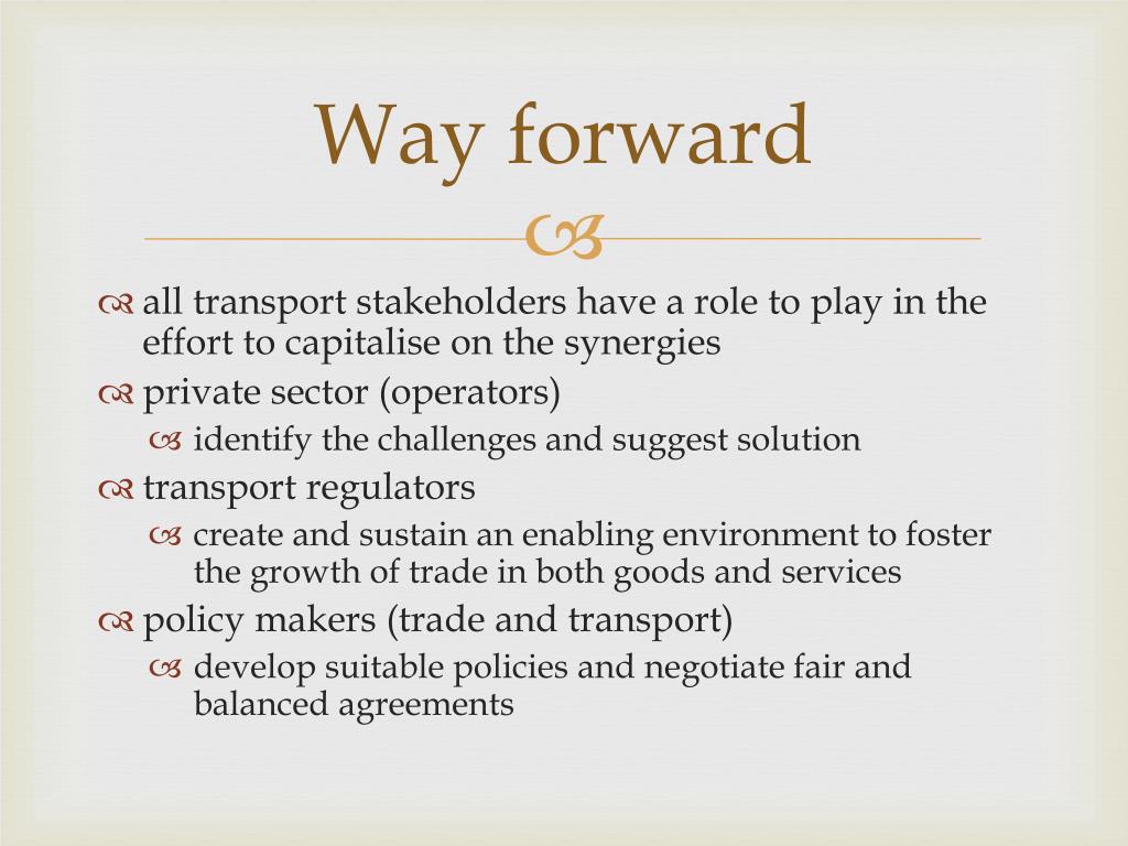 Way forward • all transport stakeholders have a role to play in the effort to capitalise on the synergies • private sector (operators) • identify the challenges and suggest solution • transport regulators • create and sustain an enabling environment to foster the growth of trade in both goods and services • policy makers (trade and transport) • develop suitable policies and negotiate fair and balanced agreements