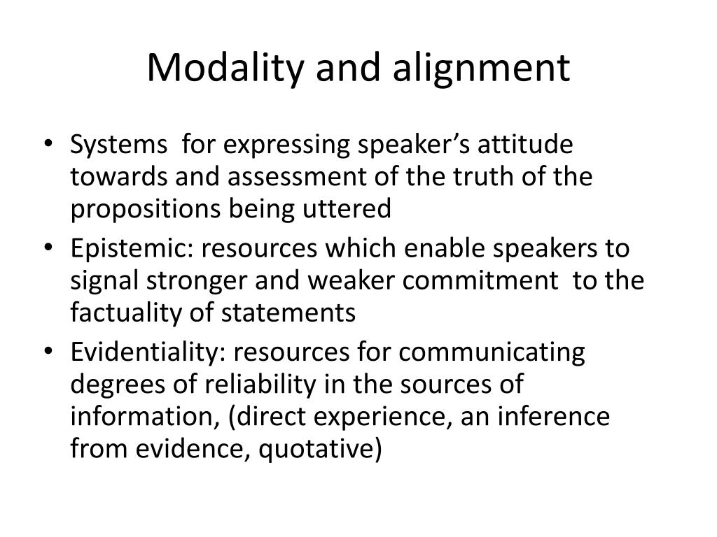 Modality and alignment • Systemsforexpressing speaker’s attitudetowards and assessmentof the truthof the propositionsbeinguttered • Epistemic: resourceswhichenablespeakerstosignalstronger and weakercommitmentto the factualityofstatements • Evidentiality: resourcesforcommunicatingdegreesofreliability in the sourcesof information, (directexperience, aninferencefromevidence, quotative)