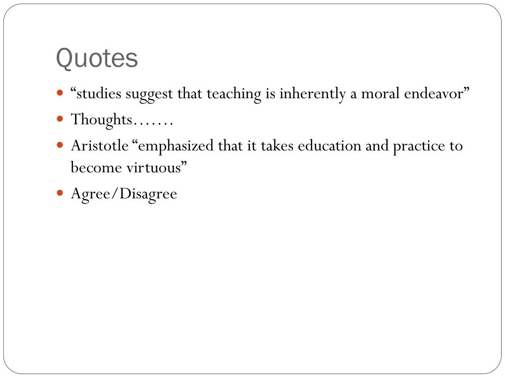 Quotes • “studies suggest that teaching is inherently a moral endeavor” • Thoughts……. • Aristotle “emphasized that it takes education and practice to become virtuous” • Agree/Disagree