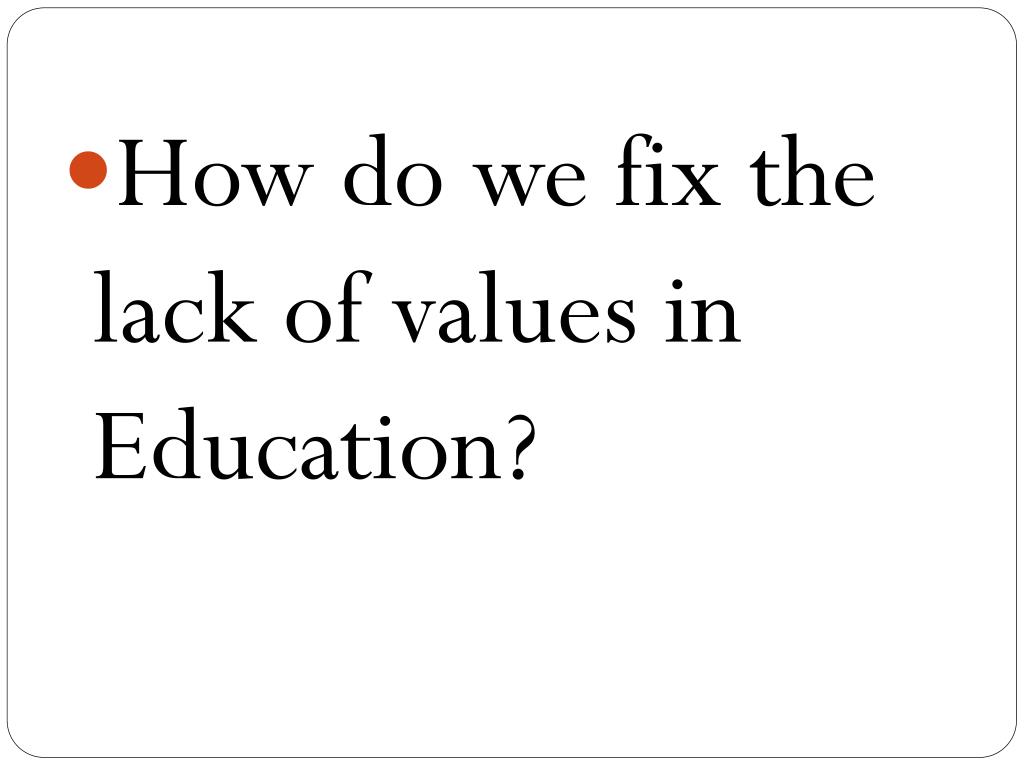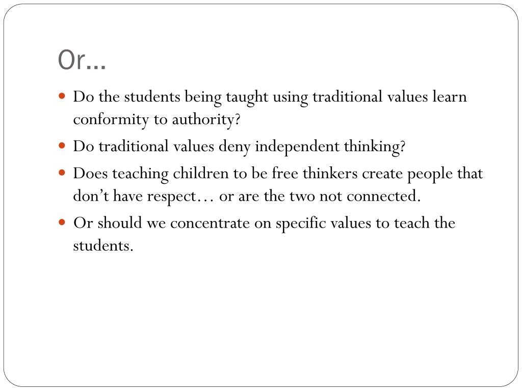 Or… • Do the students being taught using traditional values learn conformity to authority? • Do traditional values deny independent thinking? • Does teaching children to be free thinkers create people that don’t have respect… or are the two not connected. • Or should we concentrate on specific values to teach the students.