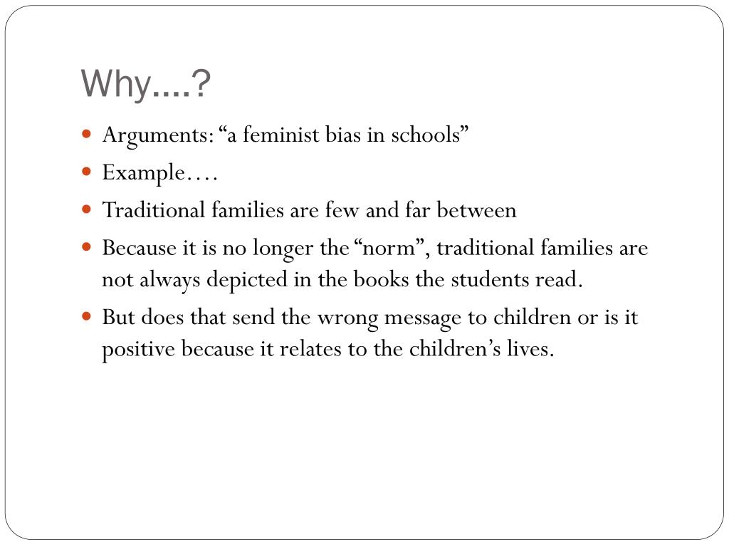 Why….? • Arguments: “a feminist bias in schools” • Example…. • Traditional families are few and far between • Because it is no longer the “norm”, traditional families are not always depicted in the books the students read. • But does that send the wrong message to children or is it positive because it relates to the children’s lives.