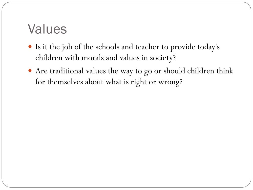 Values • Is it the job of the schools and teacher to provide today's children with morals and values in society? • Are traditional values the way to go or should children think for themselves about what is right or wrong?