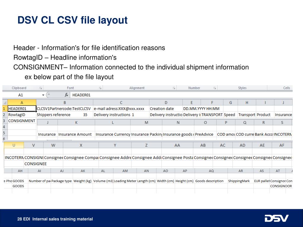 DSV CL CSV file layout • Header - Information's for file identification reasons • RowtagID – Headline information's • CONSIGNMENT– Information connected to the individual shipment information • ex below part of the file layout