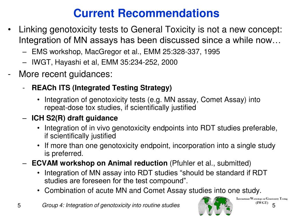 Current Recommendations • Linking genotoxicity tests to General Toxicity is not a new concept: Integration of MN assays has been discussed since a while now… • EMS workshop, MacGregor et al., EMM 25:328-337, 1995 • IWGT, Hayashi et al, EMM 35:234-252, 2000 • More recent guidances: • REACh ITS (Integrated Testing Strategy) • Integration of genotoxicity tests (e.g. MN assay, Comet Assay) into repeat-dose tox studies, if scientifically justified • ICH S2(R) draft guidance • Integration of in vivo genotoxicity endpoints into RDT studies preferable, if scientifically justified • If more than one genotoxicity endpoint, incorporation into a single study is preferred. • ECVAM workshopon Animal reduction (Pfuhler et al., submitted) • Integration of MN assay into RDT studies “should be standard if RDT studies are foreseen for the test compound”. • Combination of acute MN and Comet Assay studies into one study. Group 4: Integration of genotoxicity into routine studies