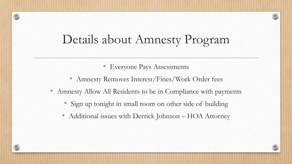 Details about Amnesty Program • Everyone Pays Assessments • Amnesty Removes Interest/Fines/Work Order fees • Amnesty Allow All Residents to be in Compliance with payments • Sign up tonight in small room on other side of building • Additional issues with Derrick Johnson – HOA Attorney