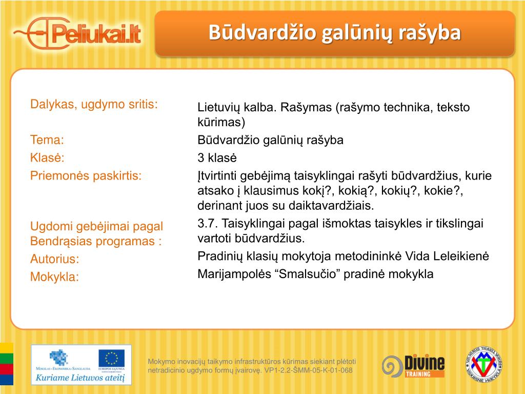 Būdvardžio galūnių rašyba. Dalykas, ugdymo sritis: Tema: Klasė: Priemonės paskirtis: Ugdomi gebėjimai pagal Bendrąsias programas : Autorius: Mokykla:. Lietuvių kalba. Rašymas (rašymo technika, teksto kūrimas) Būdvardžio galūnių rašyba 3 klasė