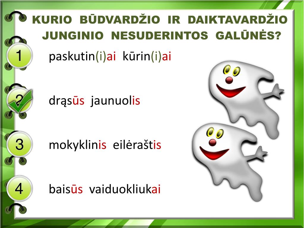 KURIO BŪDVARDŽIO IR DAIKTAVARDŽIO JUNGINIO NESUDERINTOS GALŪNĖS? paskutin(i)ai kūrin(i)ai drąsūs jaunuolis mokyklinis eilėraštis baisūs vaiduokliukai