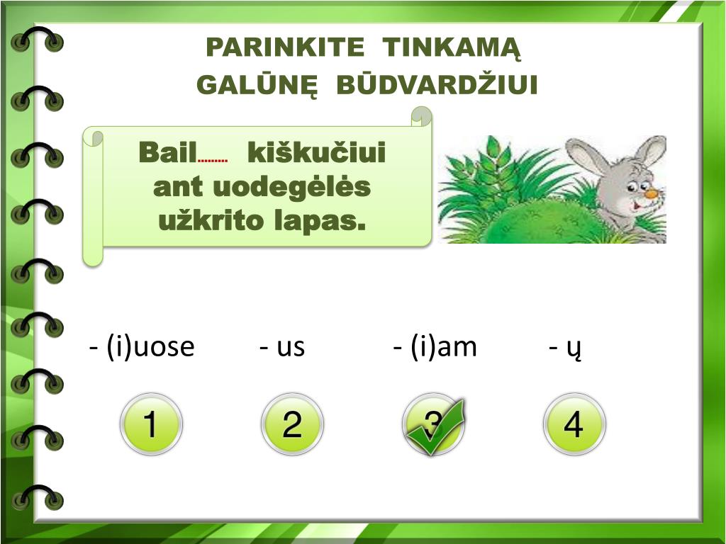PARINKITE TINKAMĄ GALŪNĘ BŪDVARDŽIUI - (i)uose - us - (i)am - ų Bail......... kiškučiui ant uodegėlės užkrito lapas.