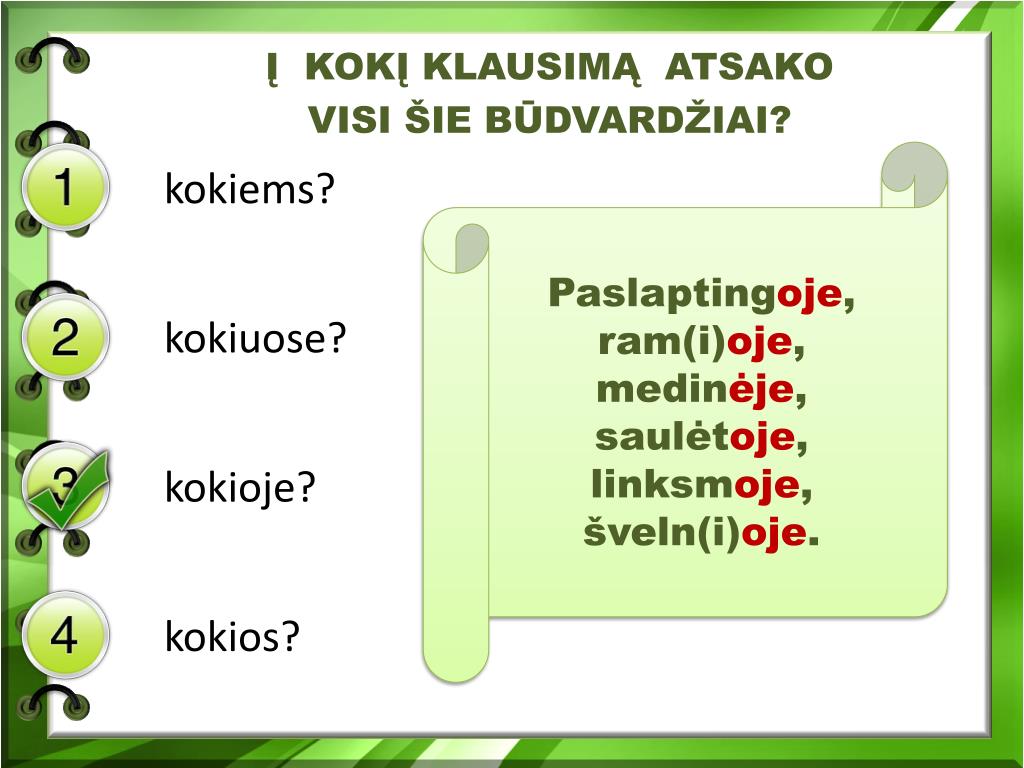 Į KOKĮ KLAUSIMĄ ATSAKO VISI ŠIE BŪDVARDŽIAI? kokiems? kokiuose? kokioje? kokios? Paslaptingoje, ram(i)oje, medinėje, saulėtoje, linksmoje, šveln(i)oje.
