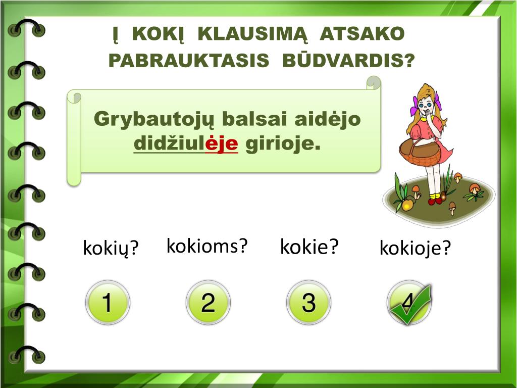 Į KOKĮ KLAUSIMĄ ATSAKO PABRAUKTASIS BŪDVARDIS? kokių? kokioms? kokie? kokioje? Grybautojų balsai aidėjo didžiulėje girioje.