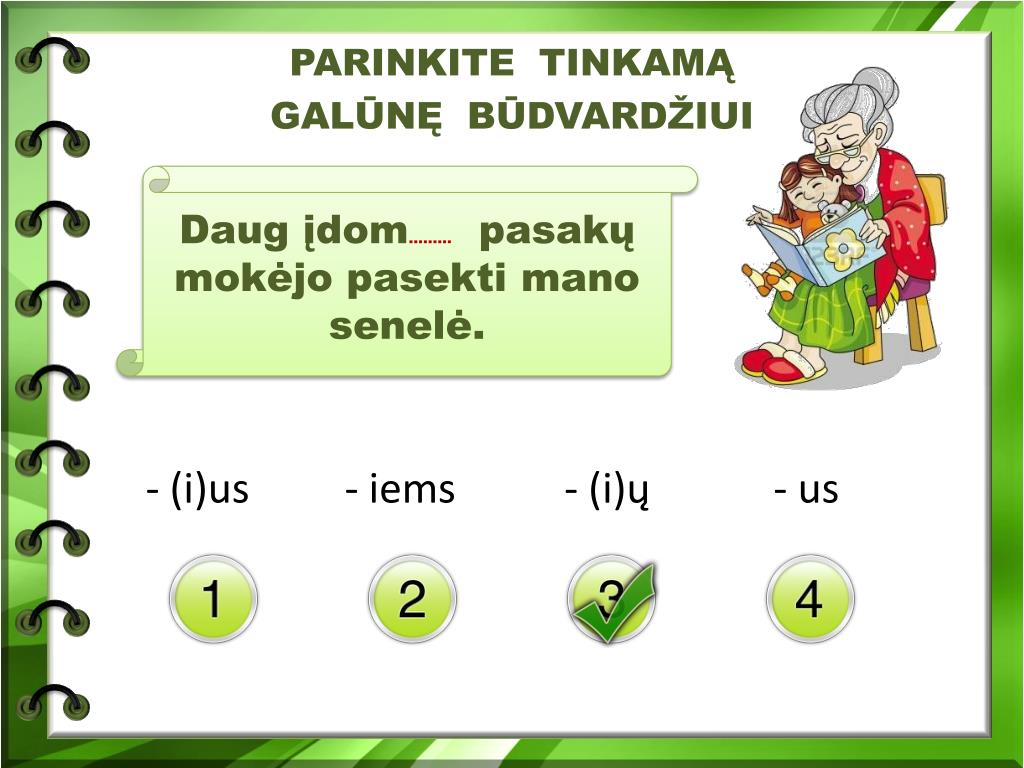 PARINKITE TINKAMĄ GALŪNĘ BŪDVARDŽIUI - (i)us - iems - (i)ų - us Daug įdom......... pasakų mokėjo pasekti mano senelė.
