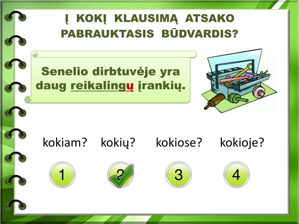 Į KOKĮ KLAUSIMĄ ATSAKO PABRAUKTASIS BŪDVARDIS? kokiam? kokių? kokiose? kokioje? Senelio dirbtuvėje yra daug reikalingų įrankių.