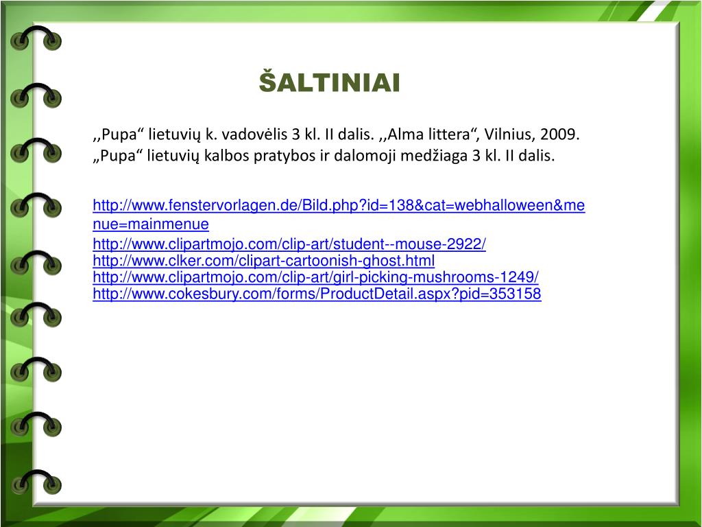 ŠALTINIAI ,,Pupa“ lietuvių k. vadovėlis 3 kl. II dalis. ,,Alma littera“, Vilnius, 2009. „Pupa“ lietuvių kalbos pratybos ir dalomoji medžiaga 3 kl. II dalis. http://www.fenstervorlagen.de/Bild.php?id=138&cat=webhalloween&menue=mainmenue http://www.clipartmojo.com/clip-art/student--mouse-2922/ http://www.clker.com/clipart-cartoonish-ghost.html http://www.clipartmojo.com/clip-art/girl-picking-mushrooms-1249/ http://www.cokesbury.com/forms/ProductDetail.aspx?pid=353158