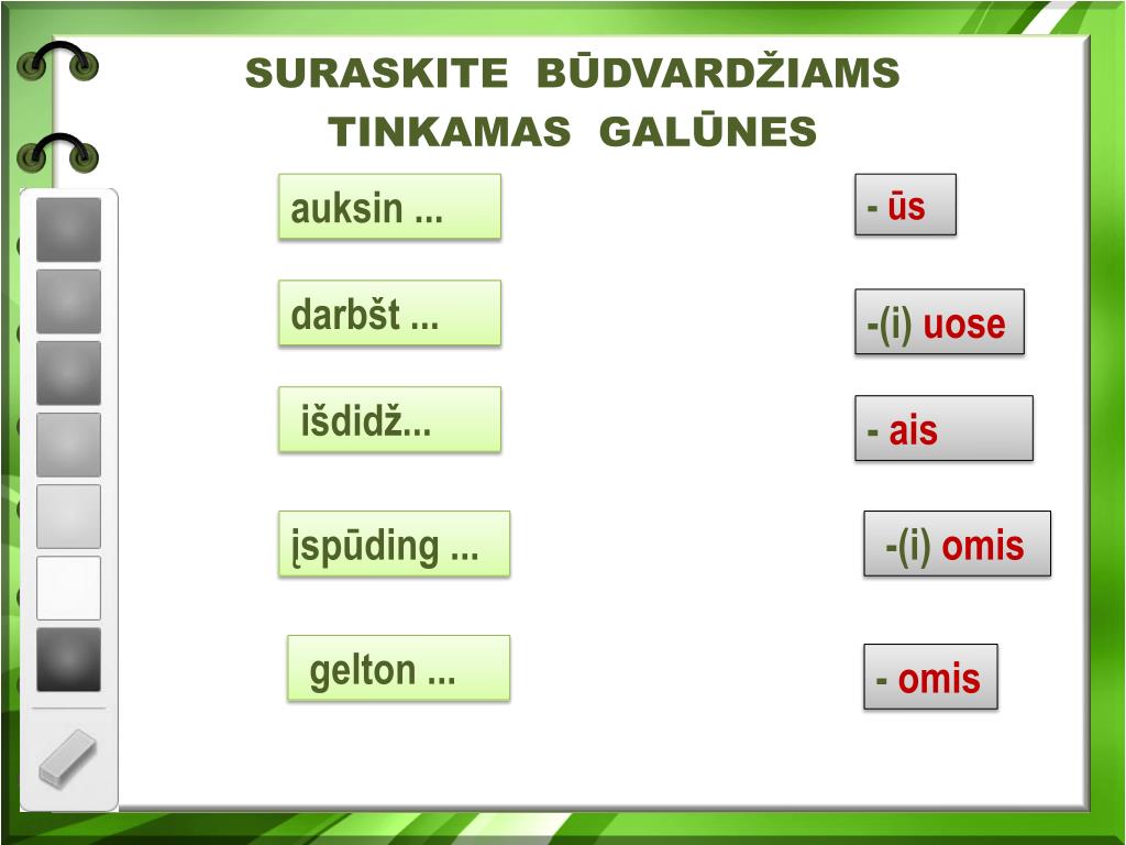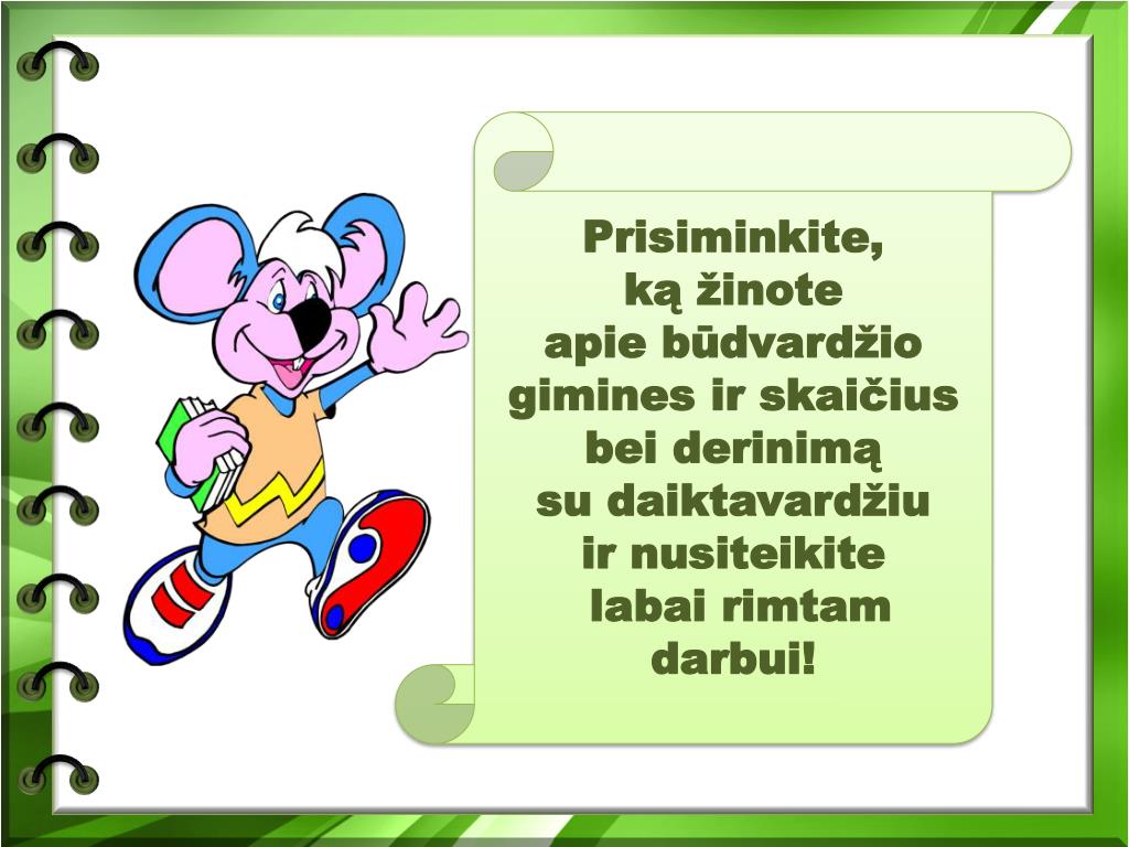 . Prisiminkite, ką žinote apie būdvardžio gimines ir skaičius bei derinimą su daiktavardžiu ir nusiteikite labai rimtam darbui!