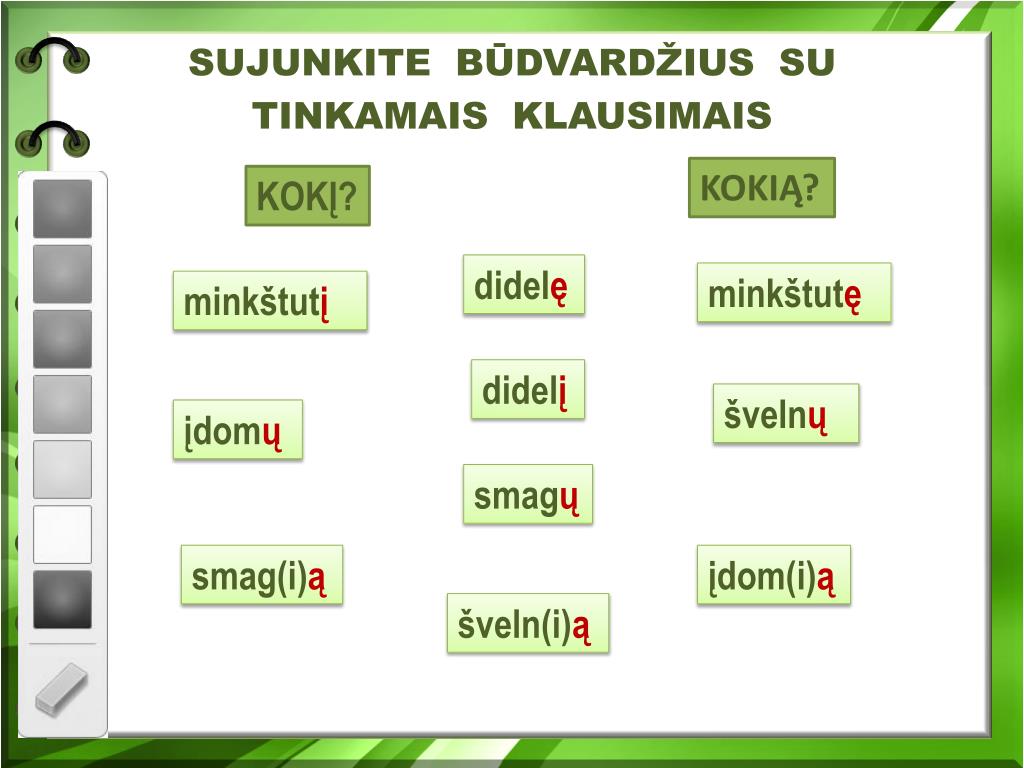SUJUNKITE BŪDVARDŽIUS SU TINKAMAIS KLAUSIMAIS KOKIĄ? KOKĮ? didelę minkštutę minkštutį didelį švelnų įdomų smagų smag(i)ą įdom(i)ą šveln(i)ą