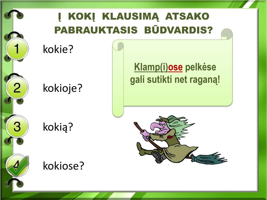 Į KOKĮ KLAUSIMĄ ATSAKO PABRAUKTASIS BŪDVARDIS? Klamp(i)ose pelkėse gali sutikti net raganą! kokie? kokioje? kokią? kokiose?