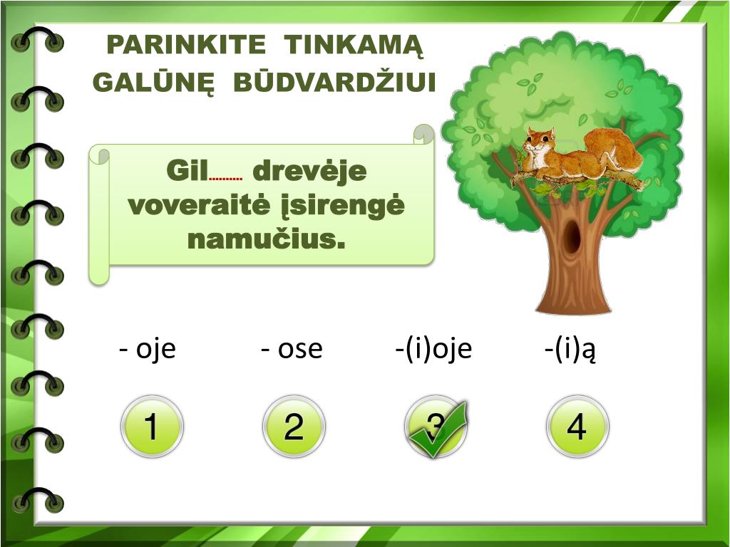PARINKITE TINKAMĄ GALŪNĘ BŪDVARDŽIUI - oje - ose -(i)oje -(i)ą Gil..........drevėje voveraitė įsirengė namučius.
