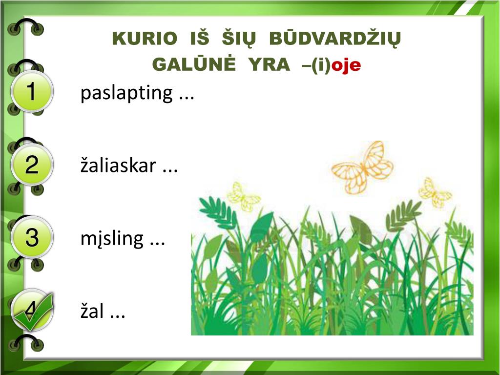 KURIO IŠ ŠIŲ BŪDVARDŽIŲ GALŪNĖ YRA –(i)oje paslapting ... žaliaskar ... mįsling ... žal ...
