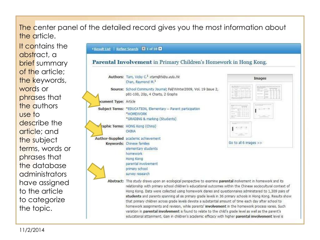 It contains the abstract, a brief summary of the article; the keywords, words or phrases that the authors use to describe the article; and the subject terms, words or phrases that the database administrators have assigned to the article to categorize the topic. The center panel of the detailed record gives you the most information about the article.