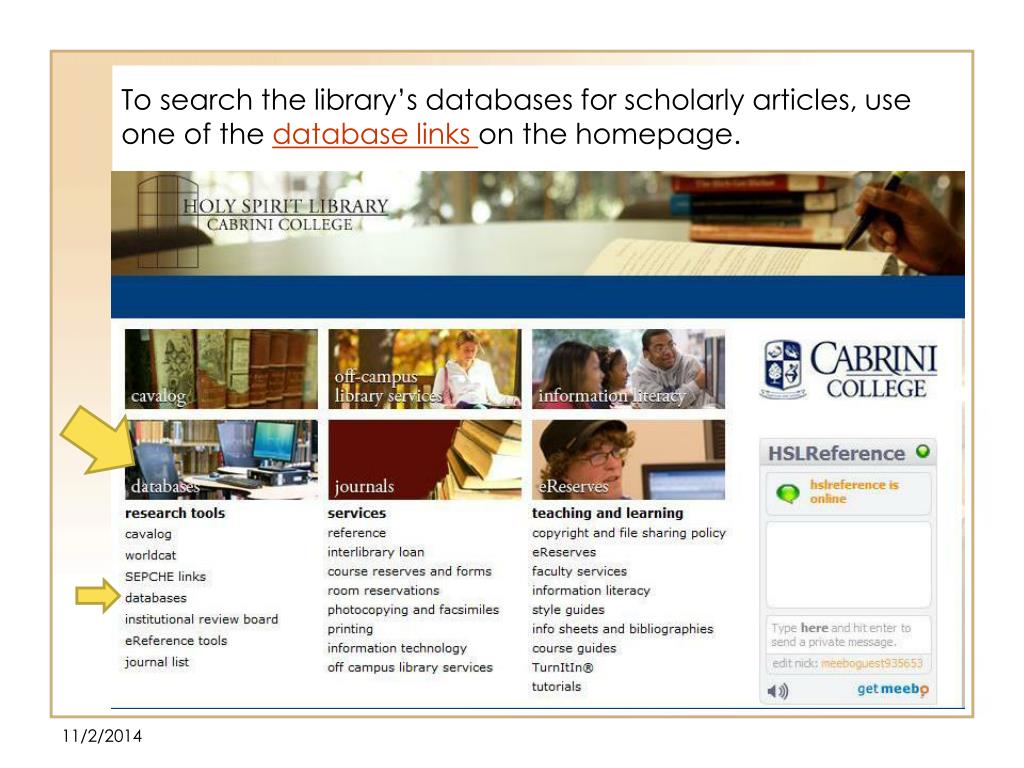 To search the library’s databases for scholarly articles, use one of the database links on the homepage.