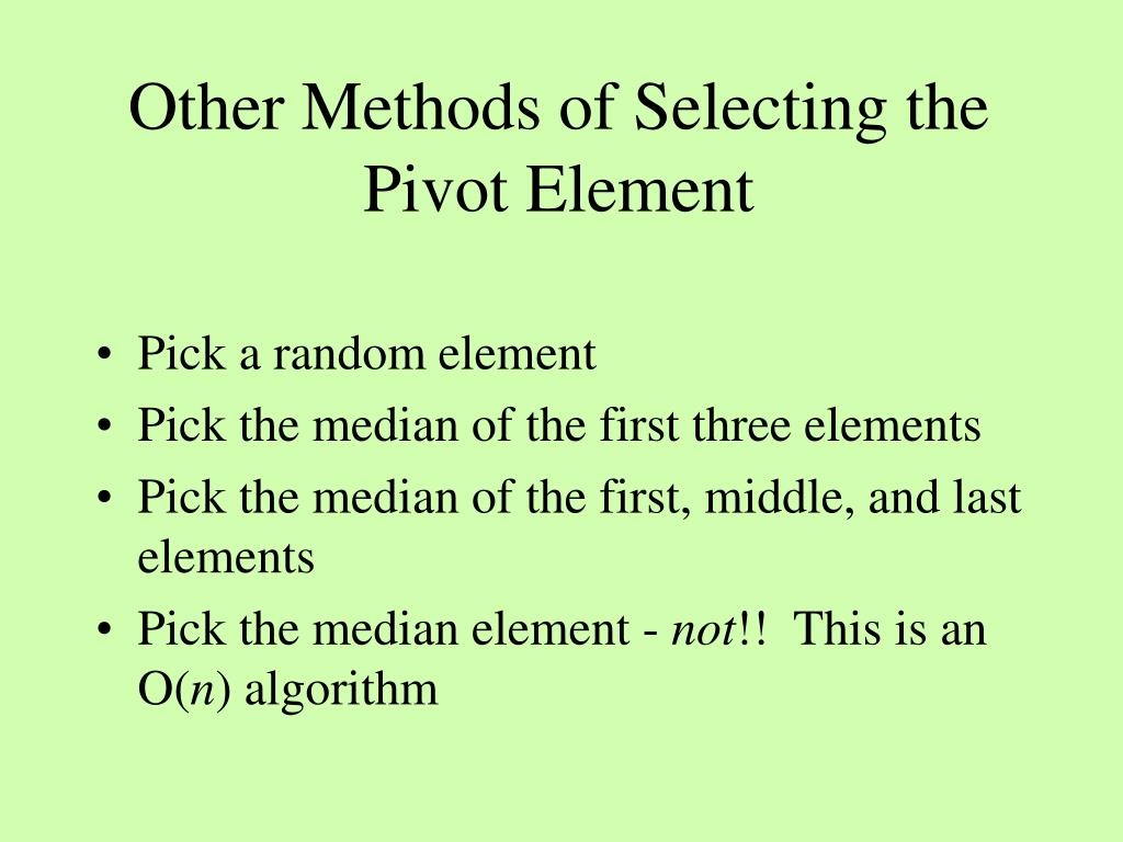 Other Methods of Selecting the Pivot Element • Pick a random element • Pick the median of the first three elements • Pick the median of the first, middle, and last elements • Pick the median element - not!! This is an O(n) algorithm