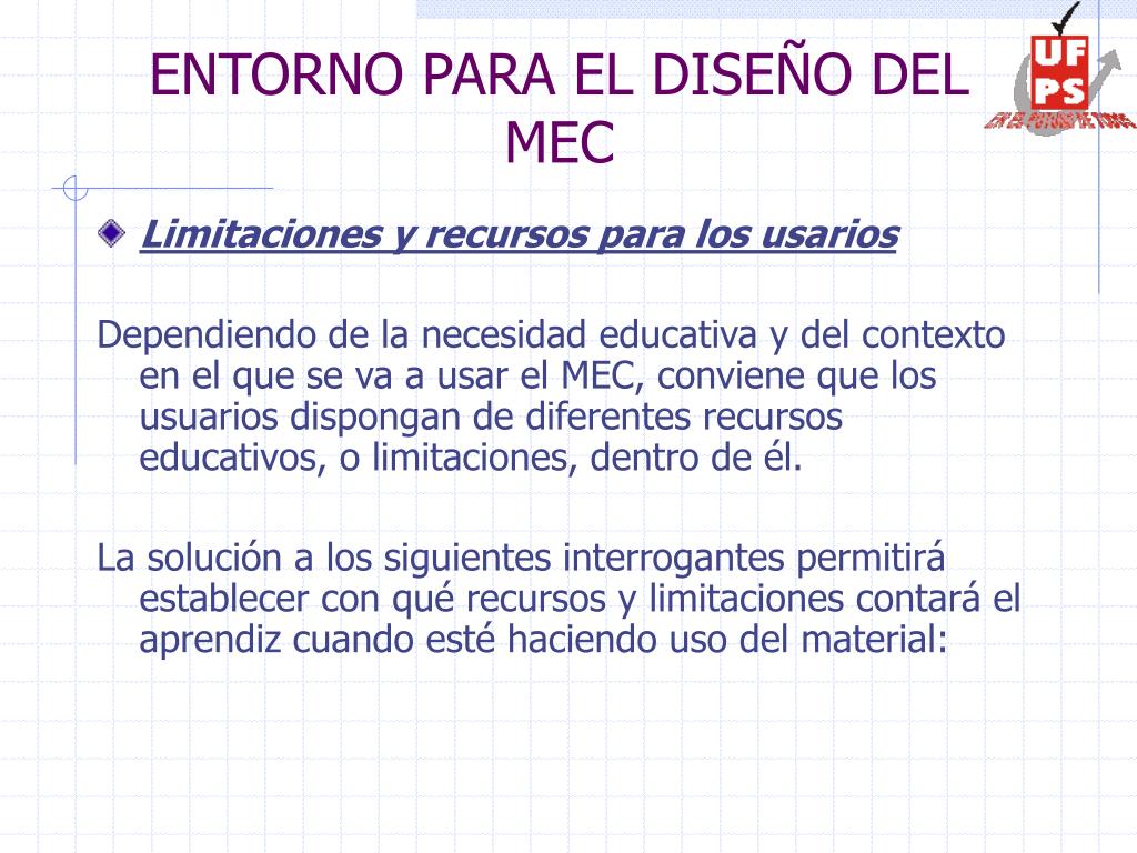 Limitaciones y recursos para los usarios Dependiendo de la necesidad educativa y del contexto en el que se va a usar el MEC, conviene que los usuarios dispongan de diferentes recursos educativos, o limitaciones, dentro de él. La solución a los siguientes interrogantes permitirá establecer con qué recursos y limitaciones contará el aprendiz cuando esté haciendo uso del material: ENTORNO PARA EL DISEÑO DEL MEC