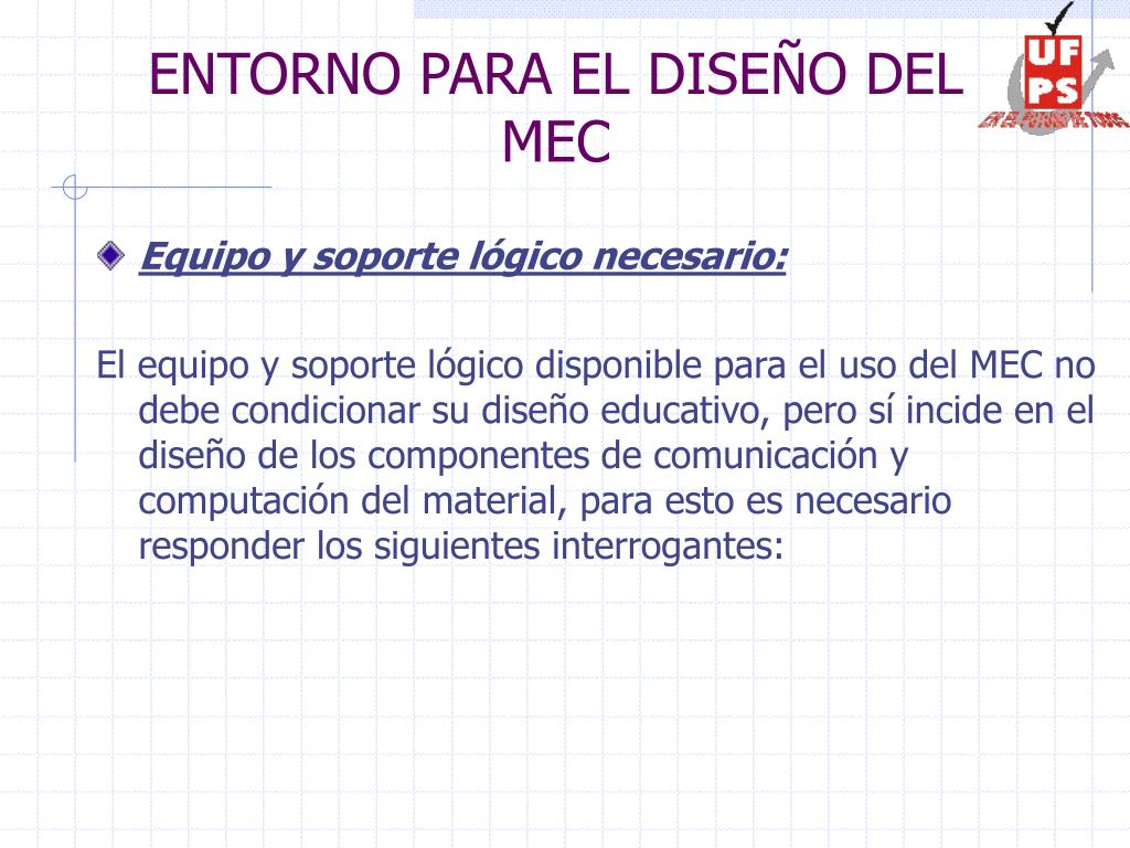 Equipo y soporte lógico necesario: El equipo y soporte lógico disponible para el uso del MEC no debe condicionar su diseño educativo, pero sí incide en el diseño de los componentes de comunicación y computación del material, para esto es necesario responder los siguientes interrogantes: ENTORNO PARA EL DISEÑO DEL MEC