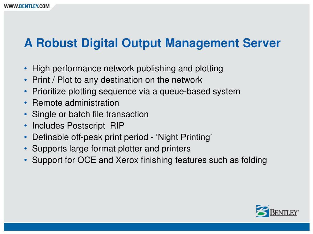 Bentley MAPscript Features • A robust Digital Output Management server • Simple Setup and Administration • Plot or publish MicroStation DGN files completely WYSIWYG • Empower users with high quality output at any format size • Supports many types of input formats and output files • Sophisticated, yet easy-to-use queues to drive any number of printer/plotter models • Provides complete cost accounting and auditing capabilities • Flexible plot set creation for archive and reprint • Offers a choice of Windows, MicroStation, or Web clients • Integration with ProjectWise and document management systems