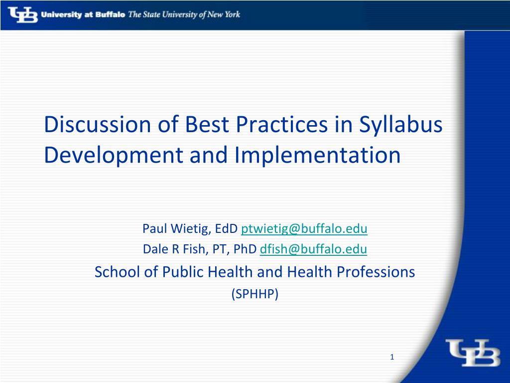 Discussion of Best Practices in Syllabus Development and Implementation Paul Wietig, EdDptwietig@buffalo.edu Dale R Fish, PT, PhD dfish@buffalo.edu School of Public Health and Health Professions (SPHHP)