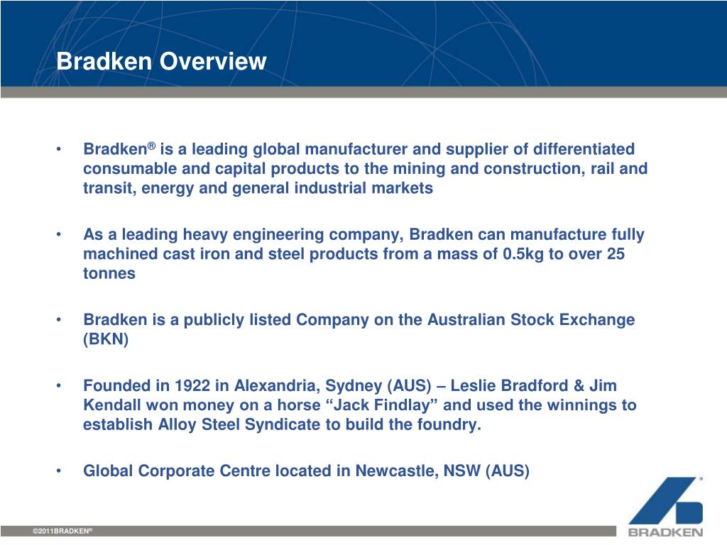 Bradken Overview • Bradken®is a leading global manufacturer and supplier of differentiated consumable and capital products to the mining and construction, rail and transit, energy and general industrial markets • As a leading heavy engineering company, Bradken can manufacture fully machined cast iron and steel products from a mass of 0.5kg to over 25 tonnes • Bradken is a publicly listed Company on the Australian Stock Exchange (BKN) • Founded in 1922 in Alexandria, Sydney (AUS) – Leslie Bradford & Jim Kendall won money on a horse “Jack Findlay” and used the winnings to establish Alloy Steel Syndicate to build the foundry. • Global Corporate Centre located in Newcastle, NSW (AUS)