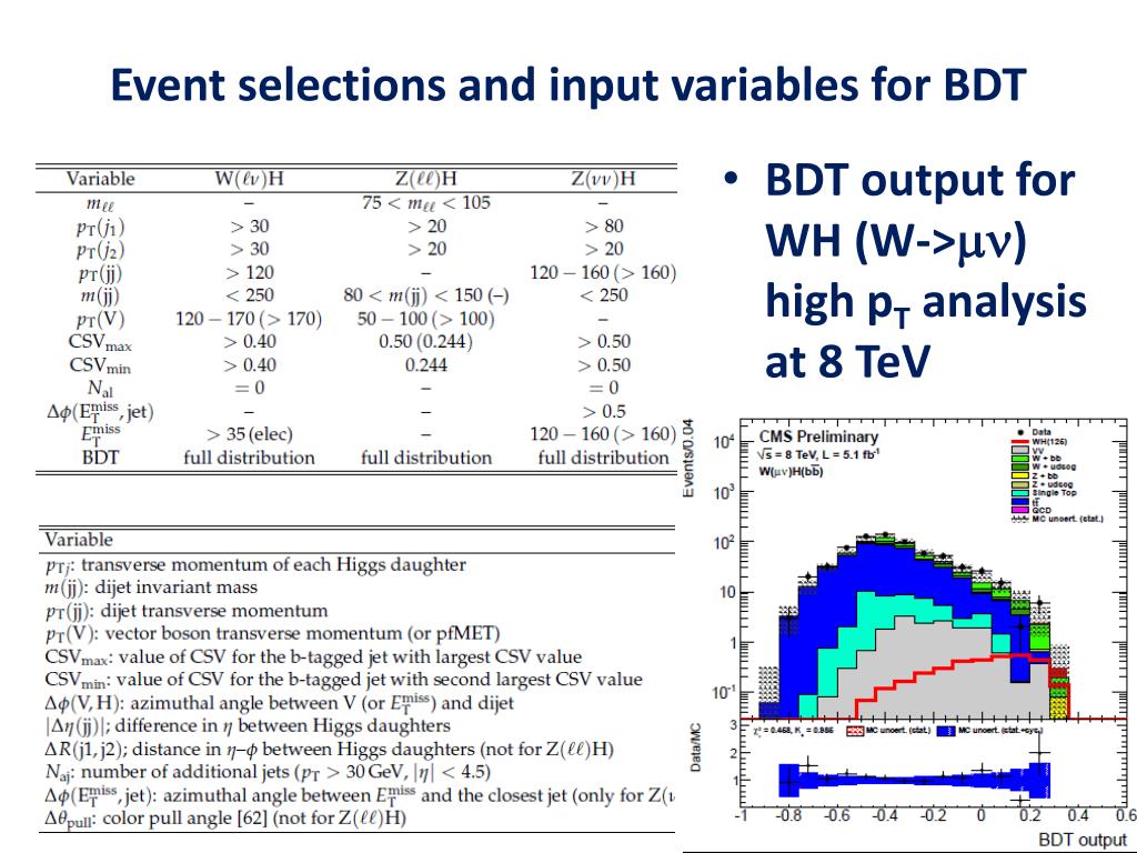 Event selections and input variables for BDT • BDT output for WH (W->mn) high pT analysis at 8 TeV