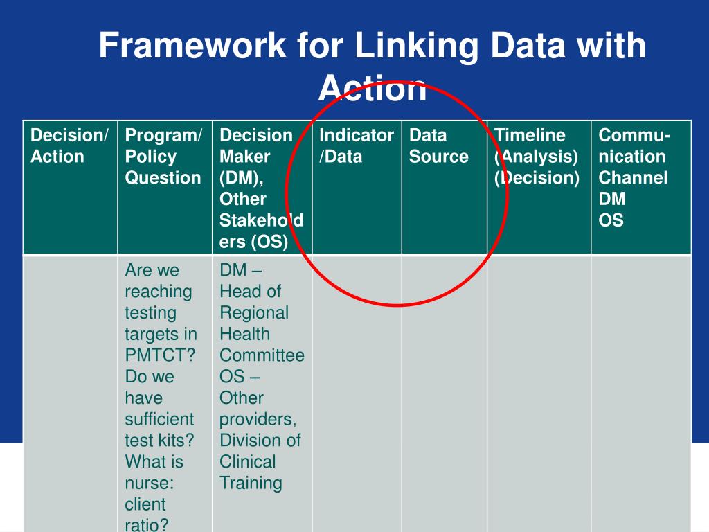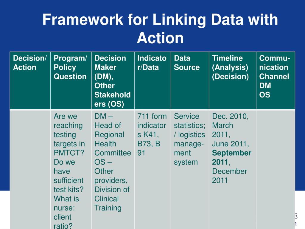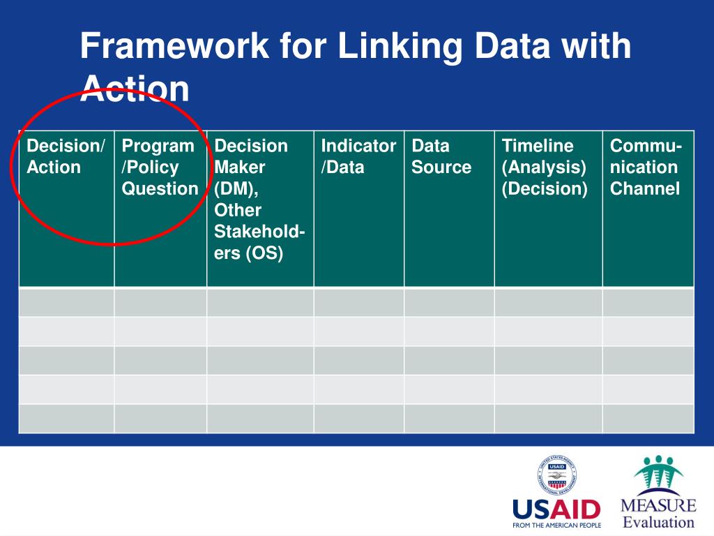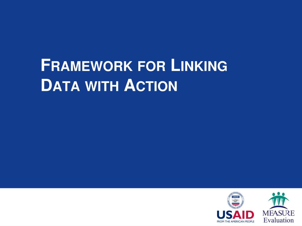 Framework for Linking Data with Action • Creates a time-bound plan for information-informed decision making • Encourages greater use of existing information • Monitors the use of information in decision making