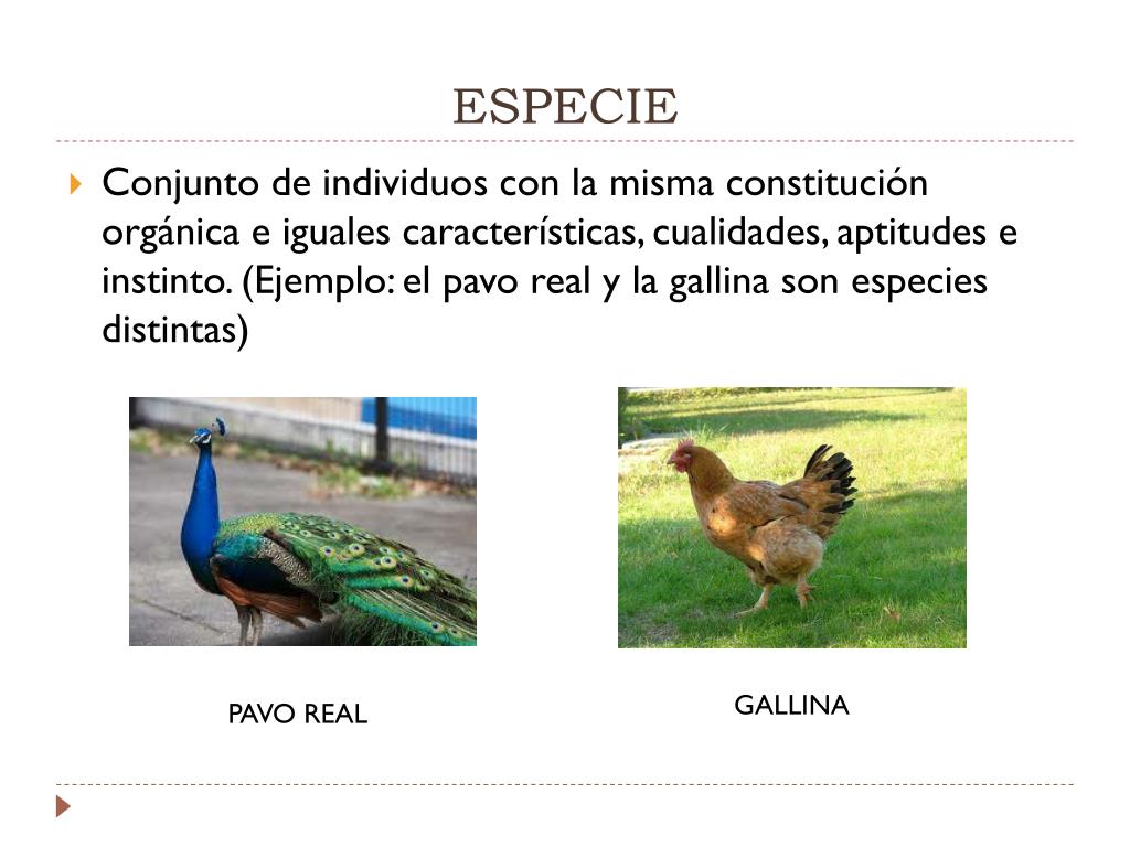 ESPECIE • Conjunto de individuos con la misma constitución orgánica e iguales características, cualidades, aptitudes e instinto. (Ejemplo: el pavo real y la gallina son especies distintas) GALLINA PAVO REAL