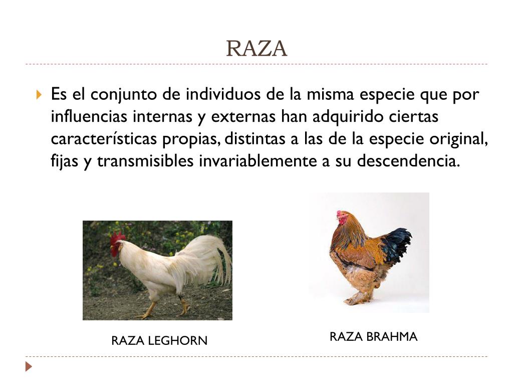 RAZA • Es el conjunto de individuos de la misma especie que por influencias internas y externas han adquirido ciertas características propias, distintas a las de la especie original, fijas y transmisibles invariablemente a su descendencia. RAZA BRAHMA RAZA LEGHORN